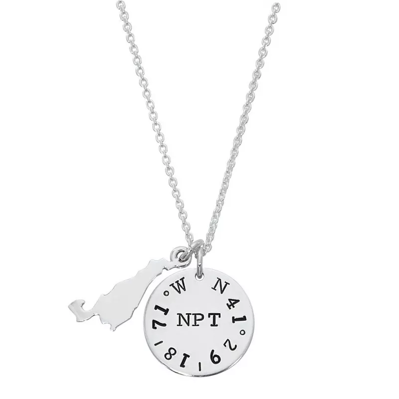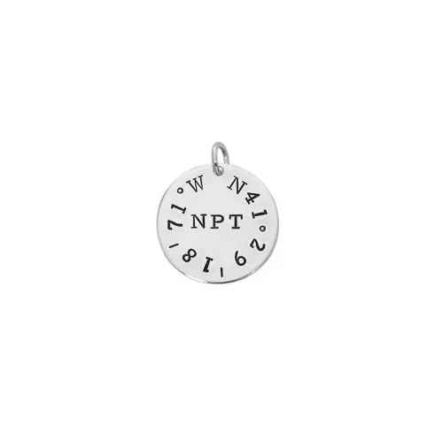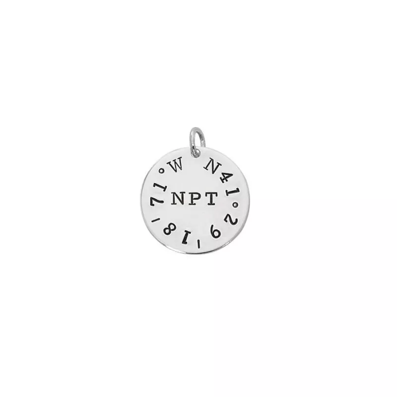 Silver disc stamped with Newport's Latitude and Longitude. Made in MA!
