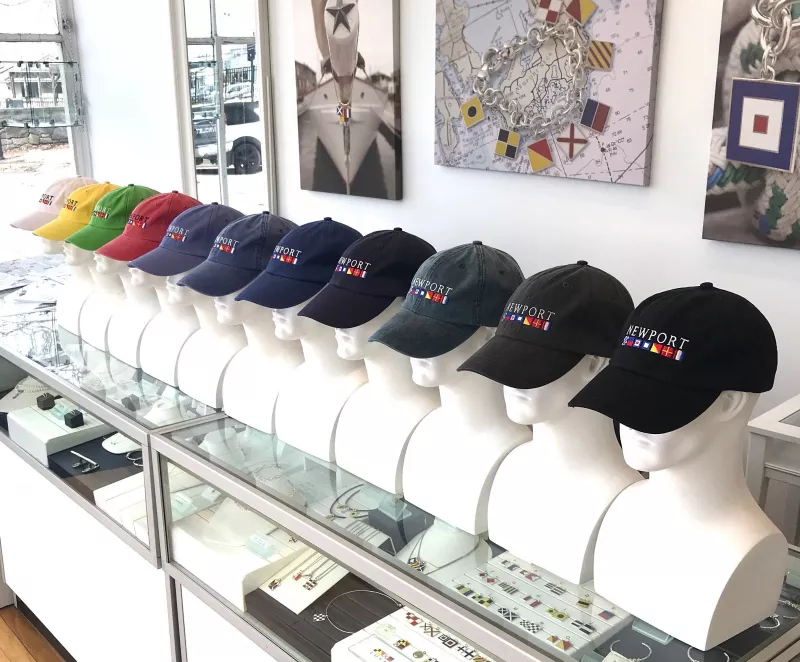 Adams cap with adjustable tuckaway leather strap and antique brass buckle.